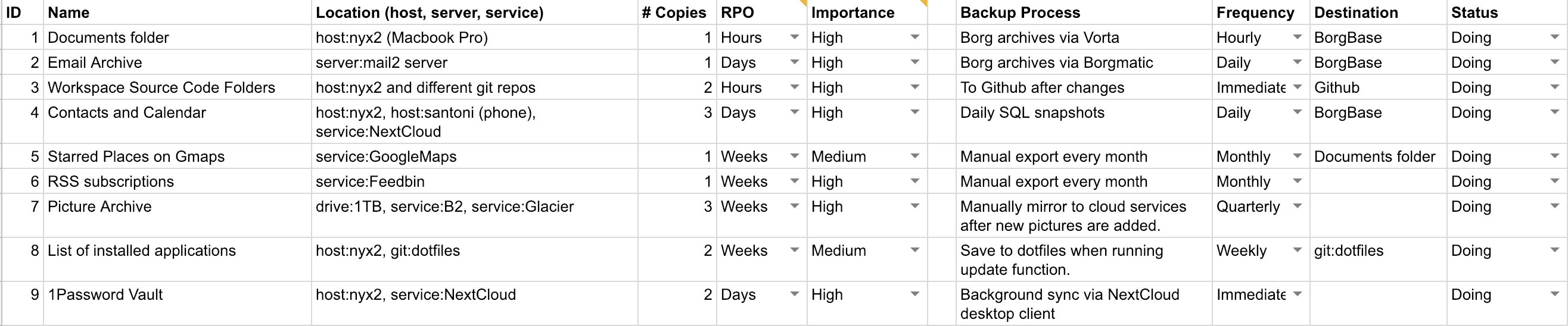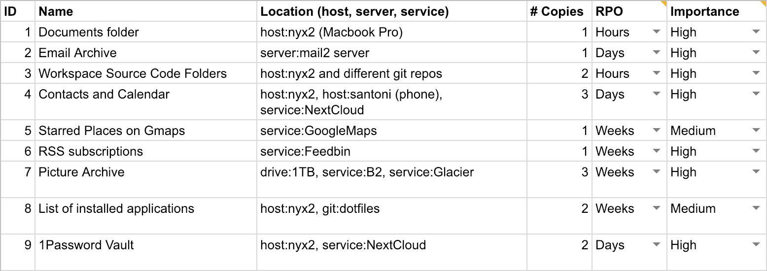 With this in mind, have another look at the template. Specifically the Location and Backup Destination columns. The former should tell you where data lives while it’s in normal use. The latter is just for backups. Sometimes this distinction is not clear cut. When in doubt use the Location column.